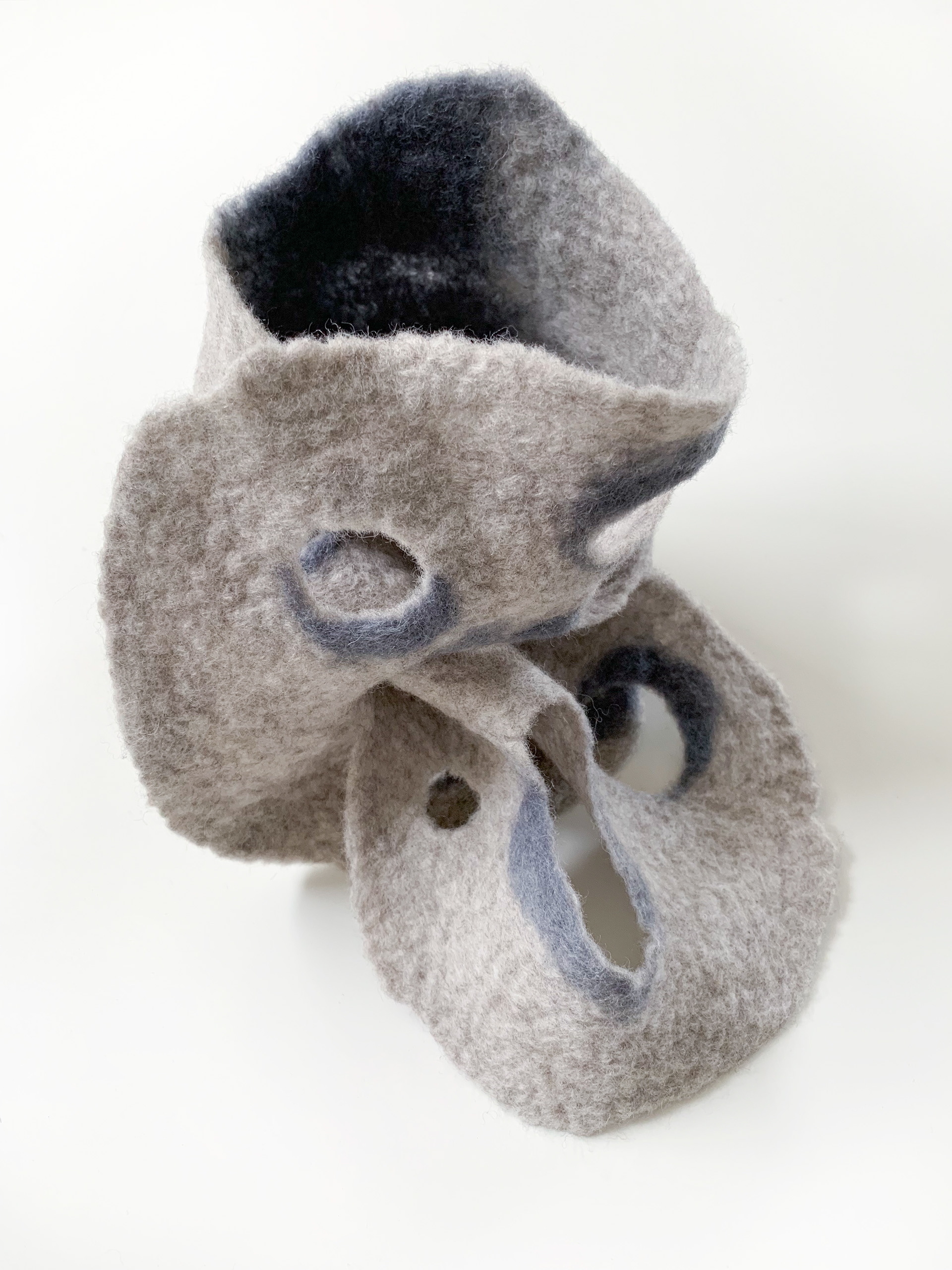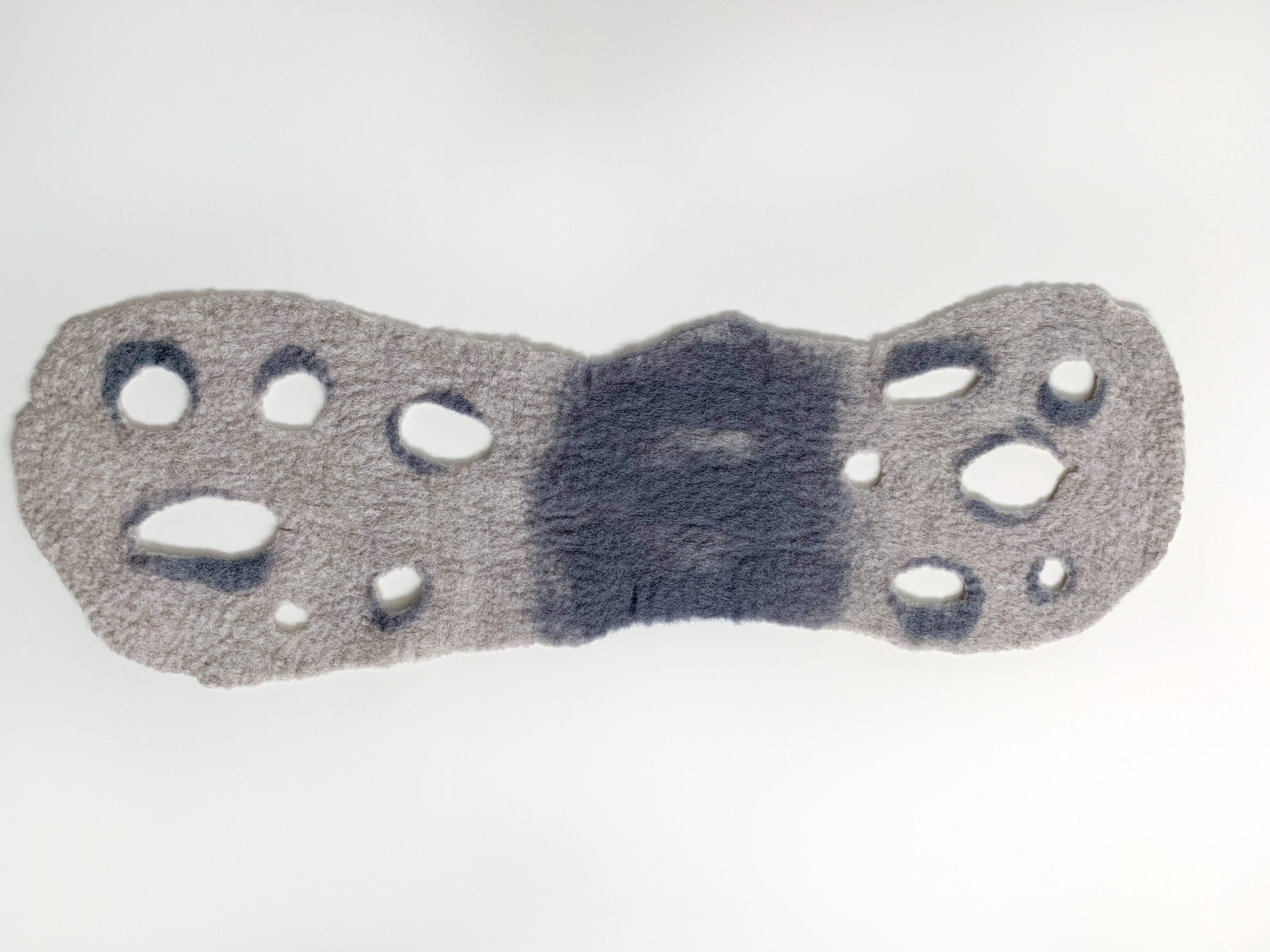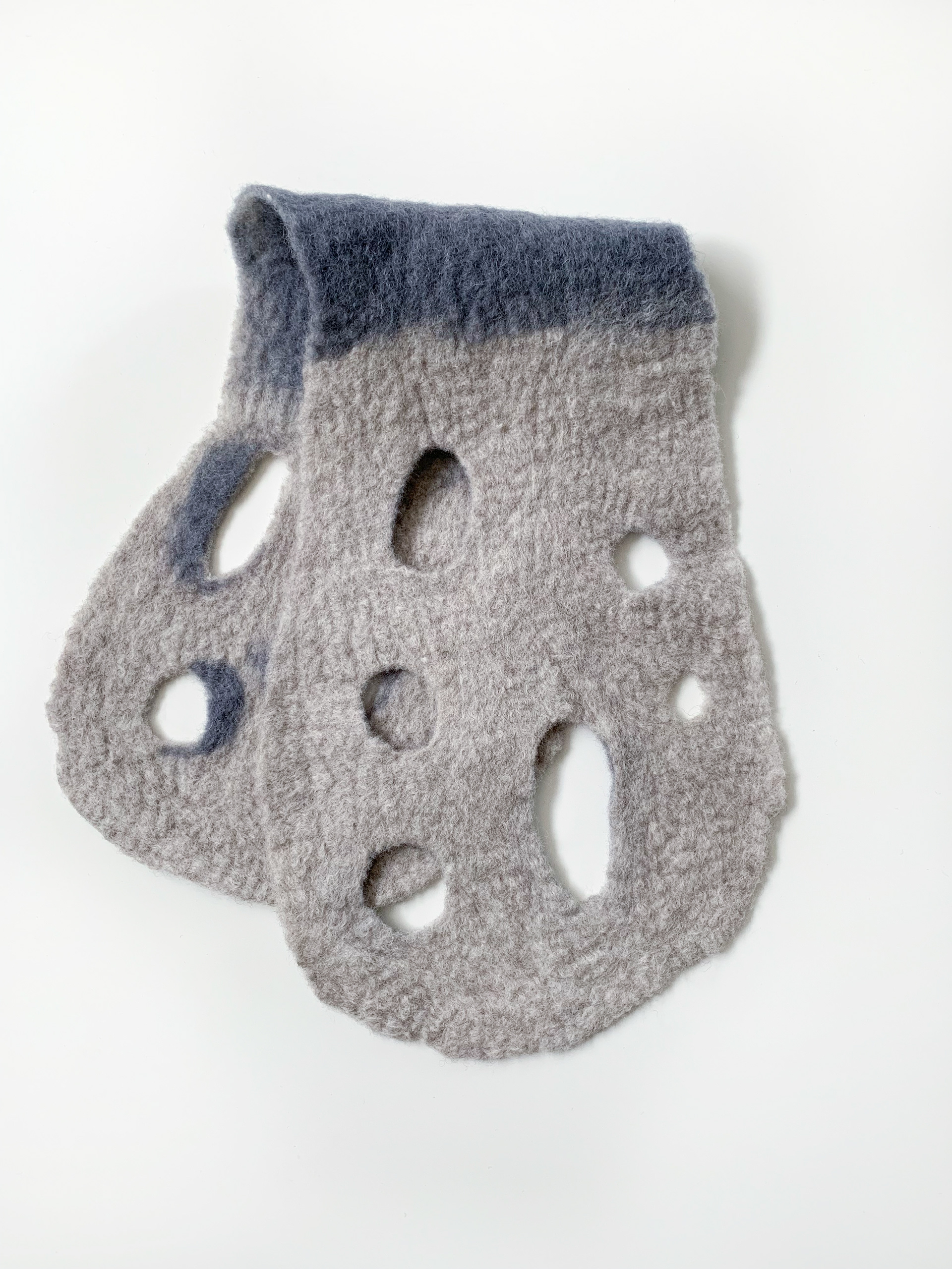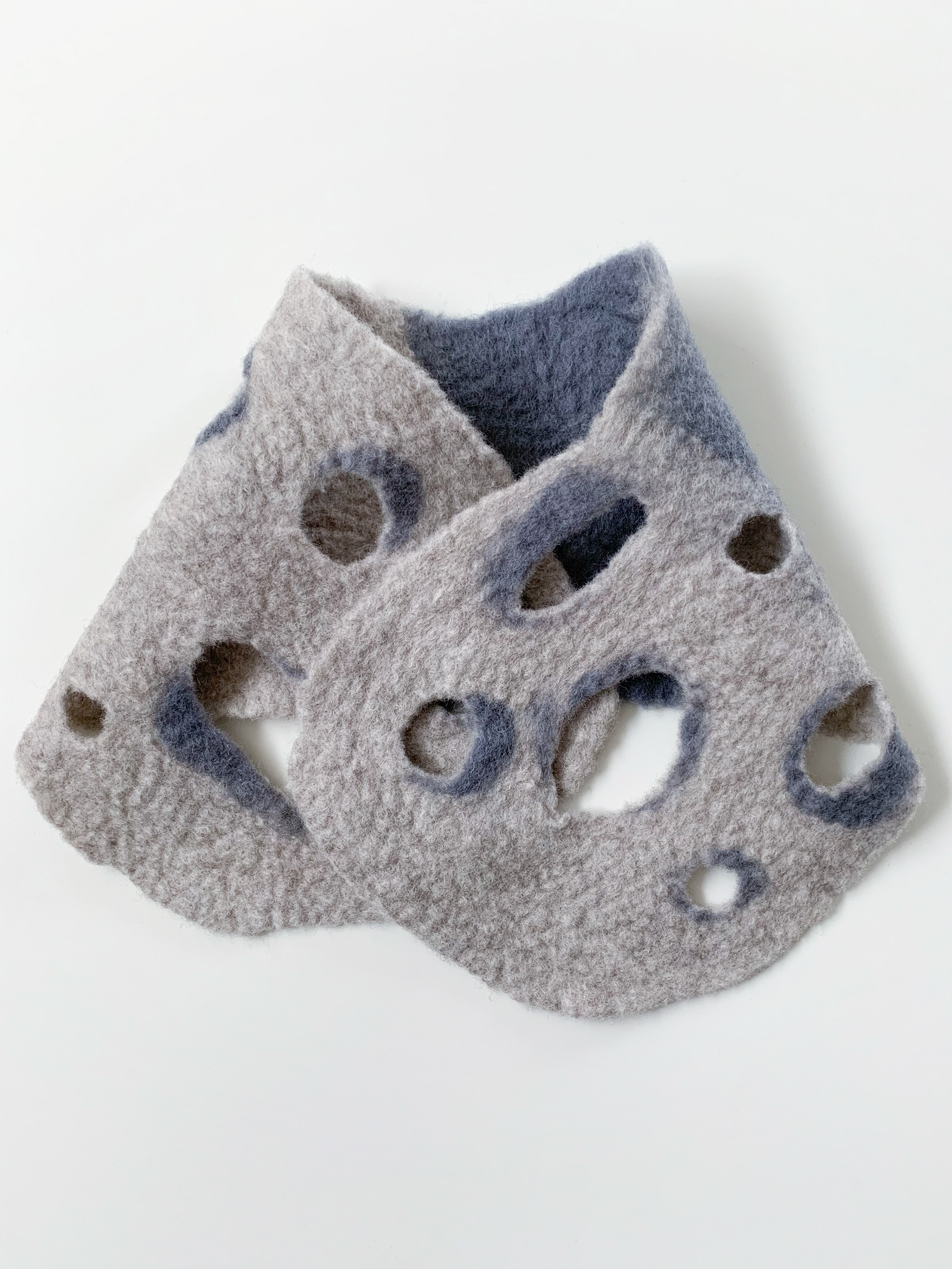 [ash] グレートーンのグラデーションがアーバンな印象のショートスカーフです。ポコポコとあいた穴デザインは、通す穴によって巻き方を変えれるようになっています。 メリノ+ロムニーウール100%