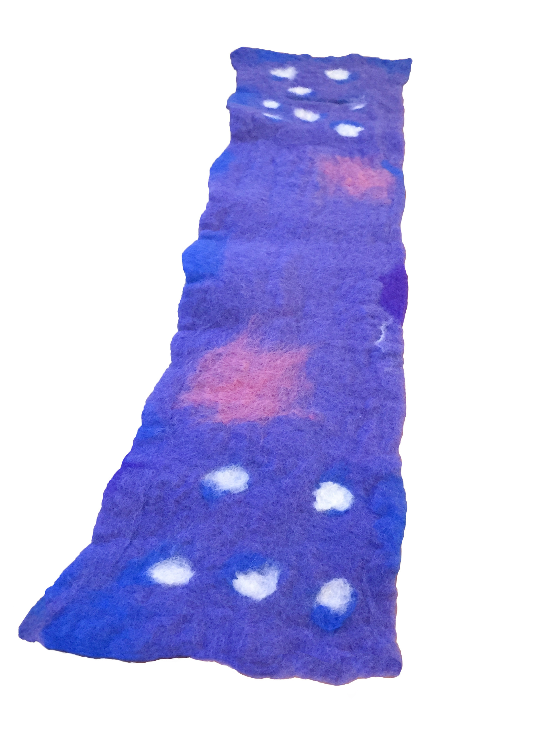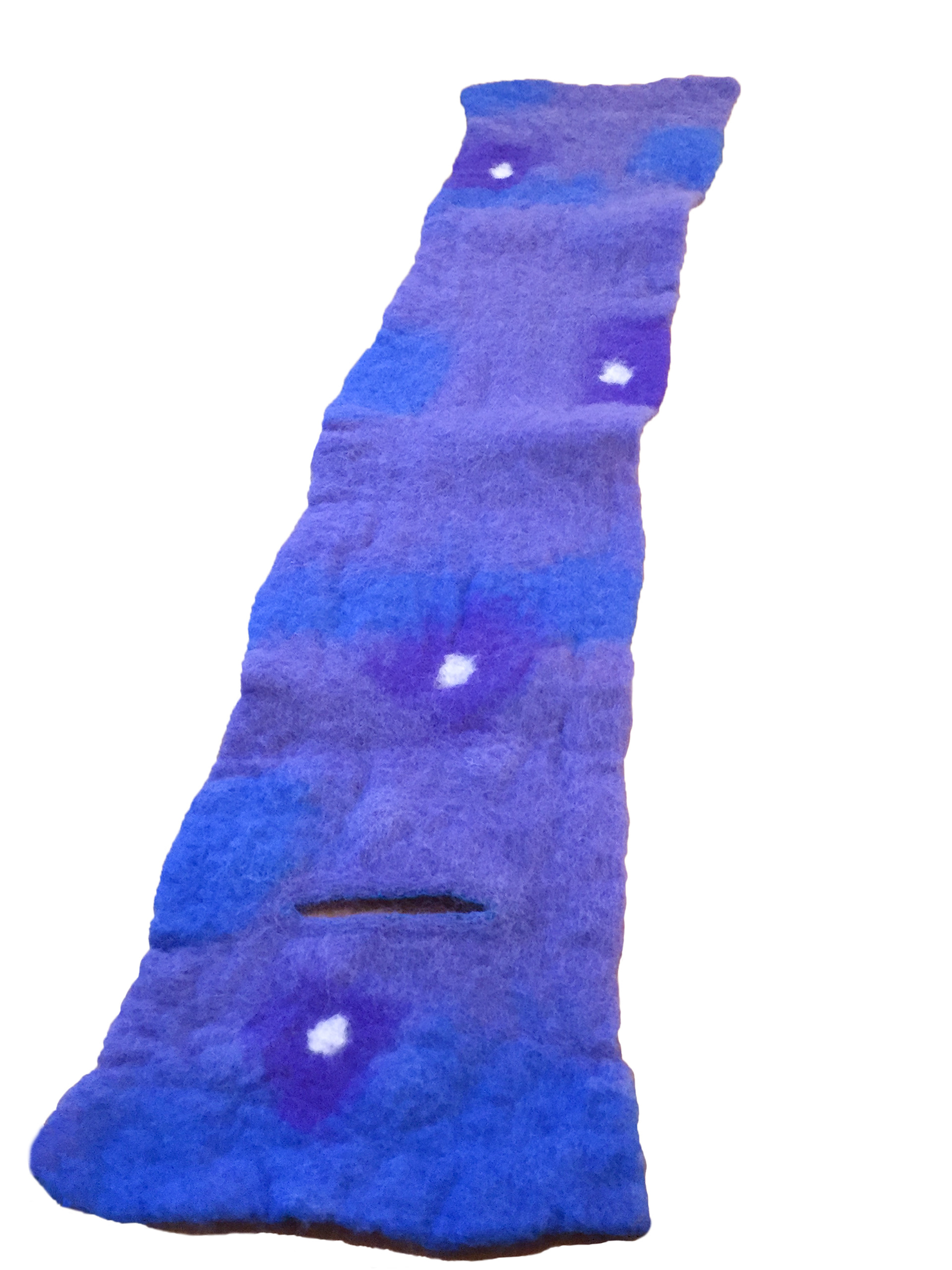 [sumire] スミレの花をイメージしたスカーフです。 首まわりにも自然とフィットするサイズです。 スカーフは片側の通し穴にもう片方を差し込んで長さ調整できます。 メリノ+ロムニーウール100%