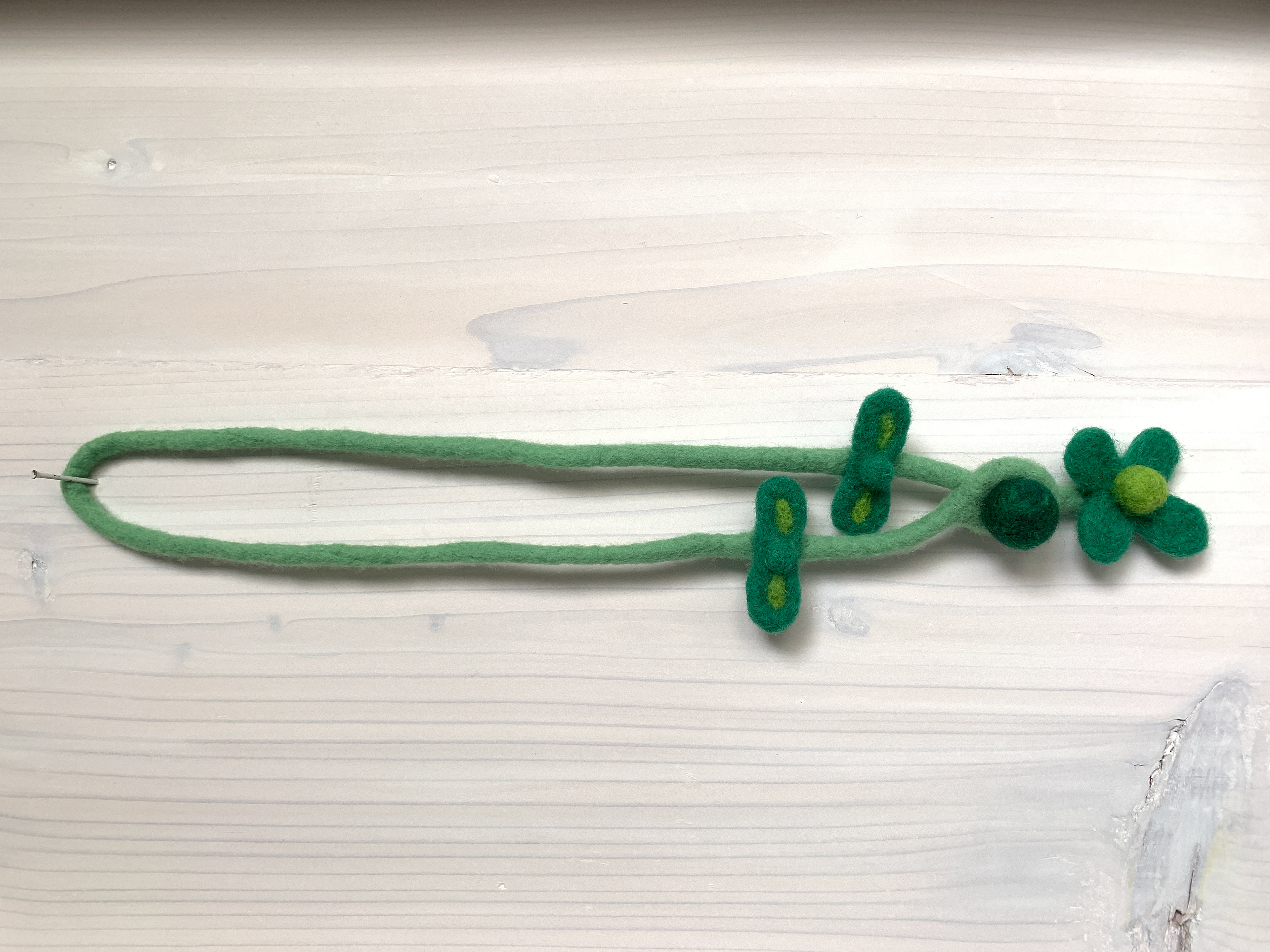 [Flower - green] 葉っぱの形がアクセントのニードルフェルト作ったネックレスです。 輪っかをボールに引っ掛けて止めます。 ロムニーウール100%