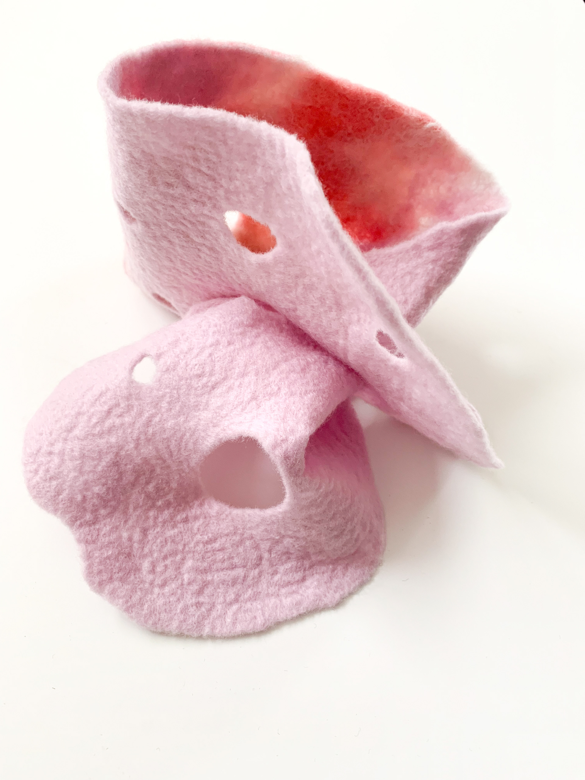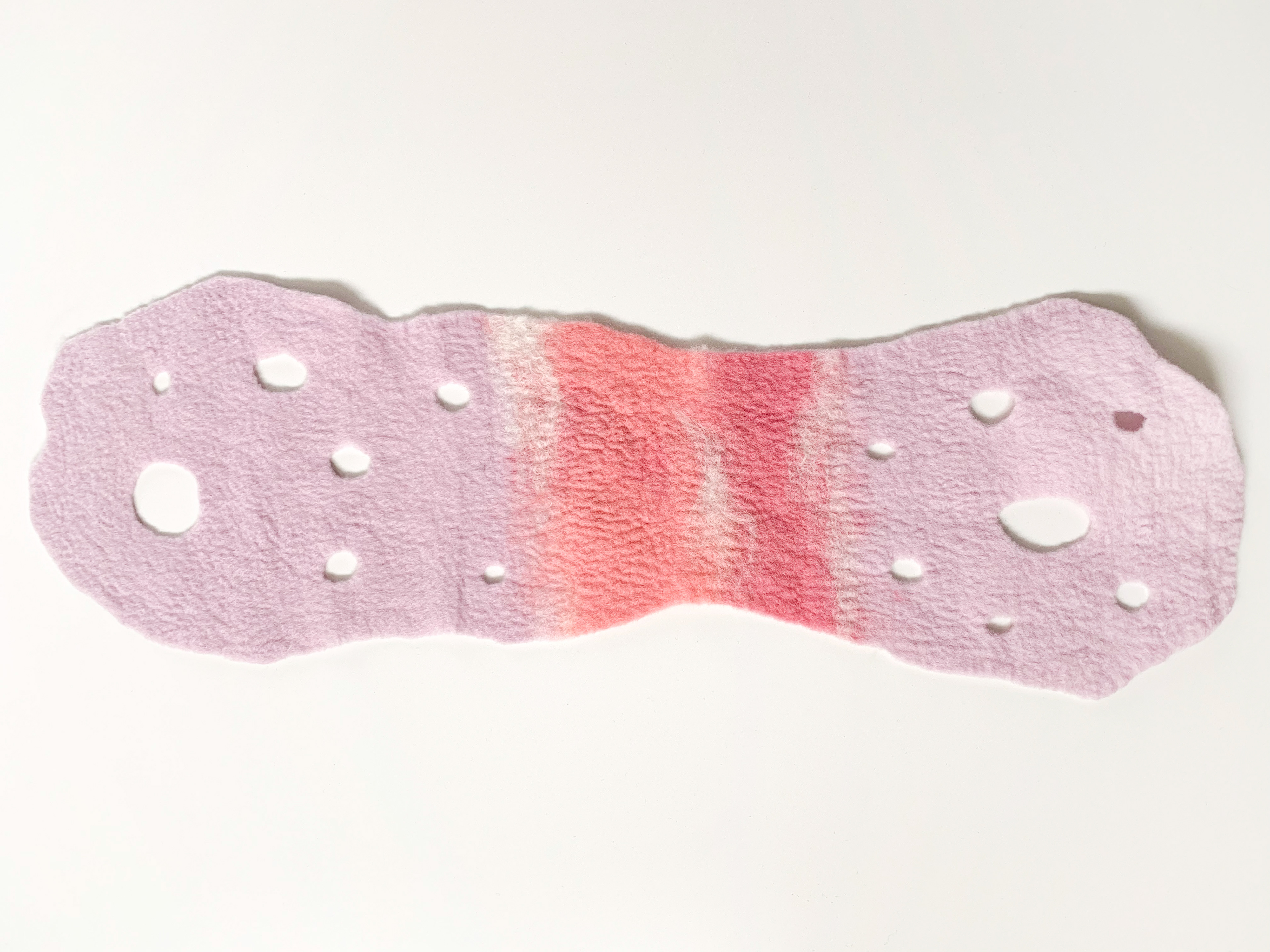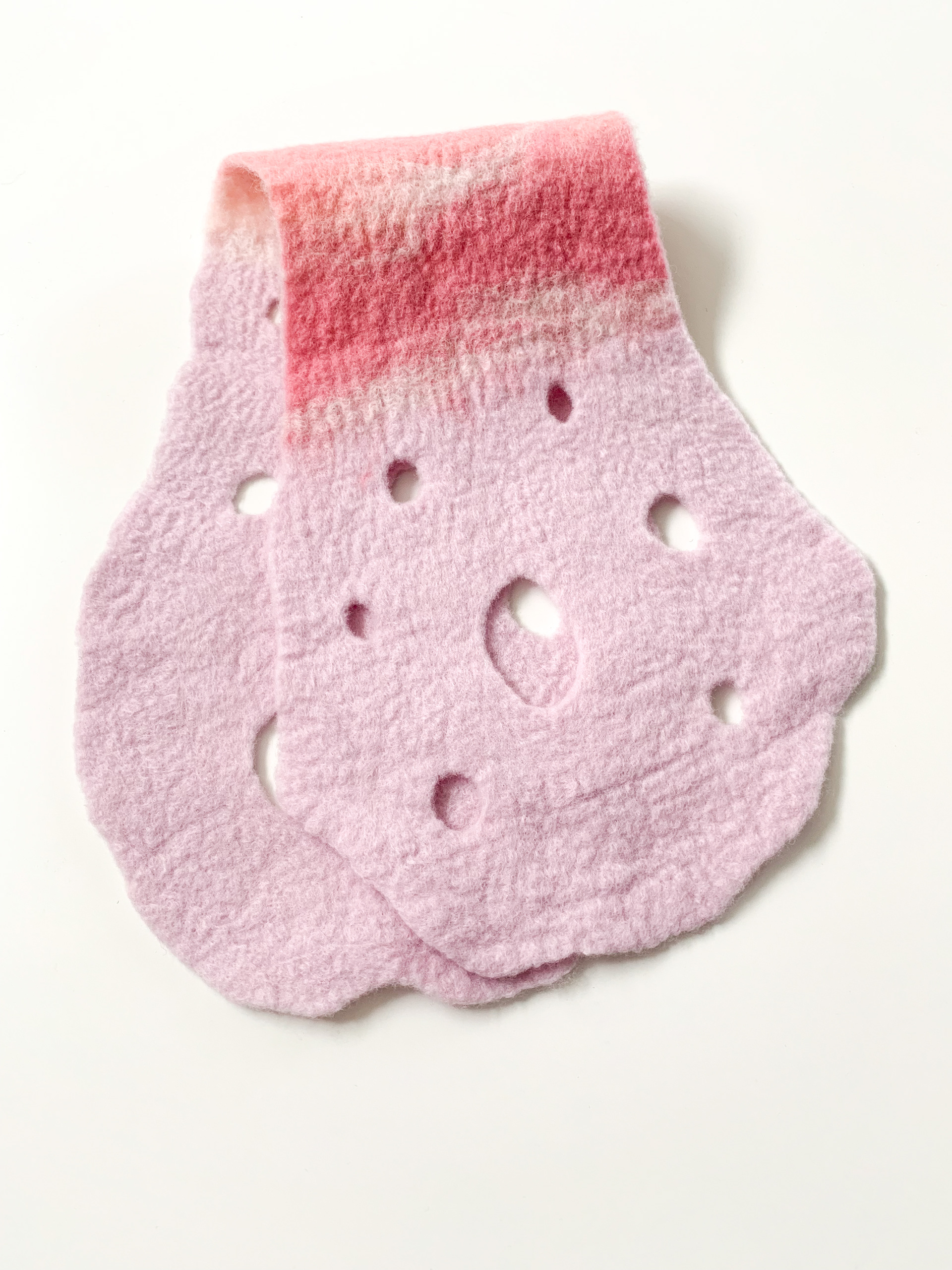 [rose] ピンクのグラデーションがローズのような印象のショートスカーフです。 ポコポコとあいた穴デザインは、通す穴によって巻き方を変えれるようになっています。 メリノ+ロムニーウール100%
