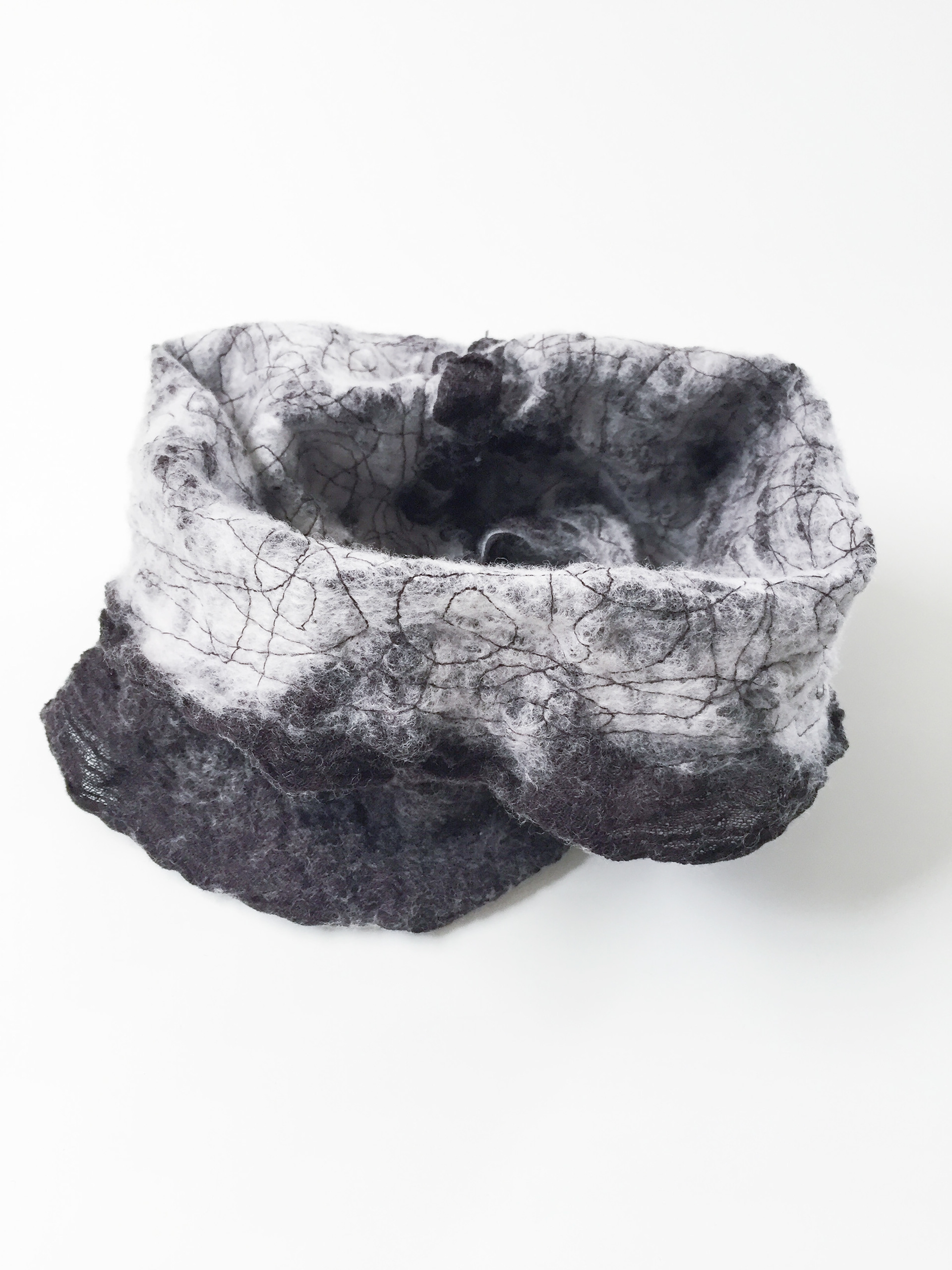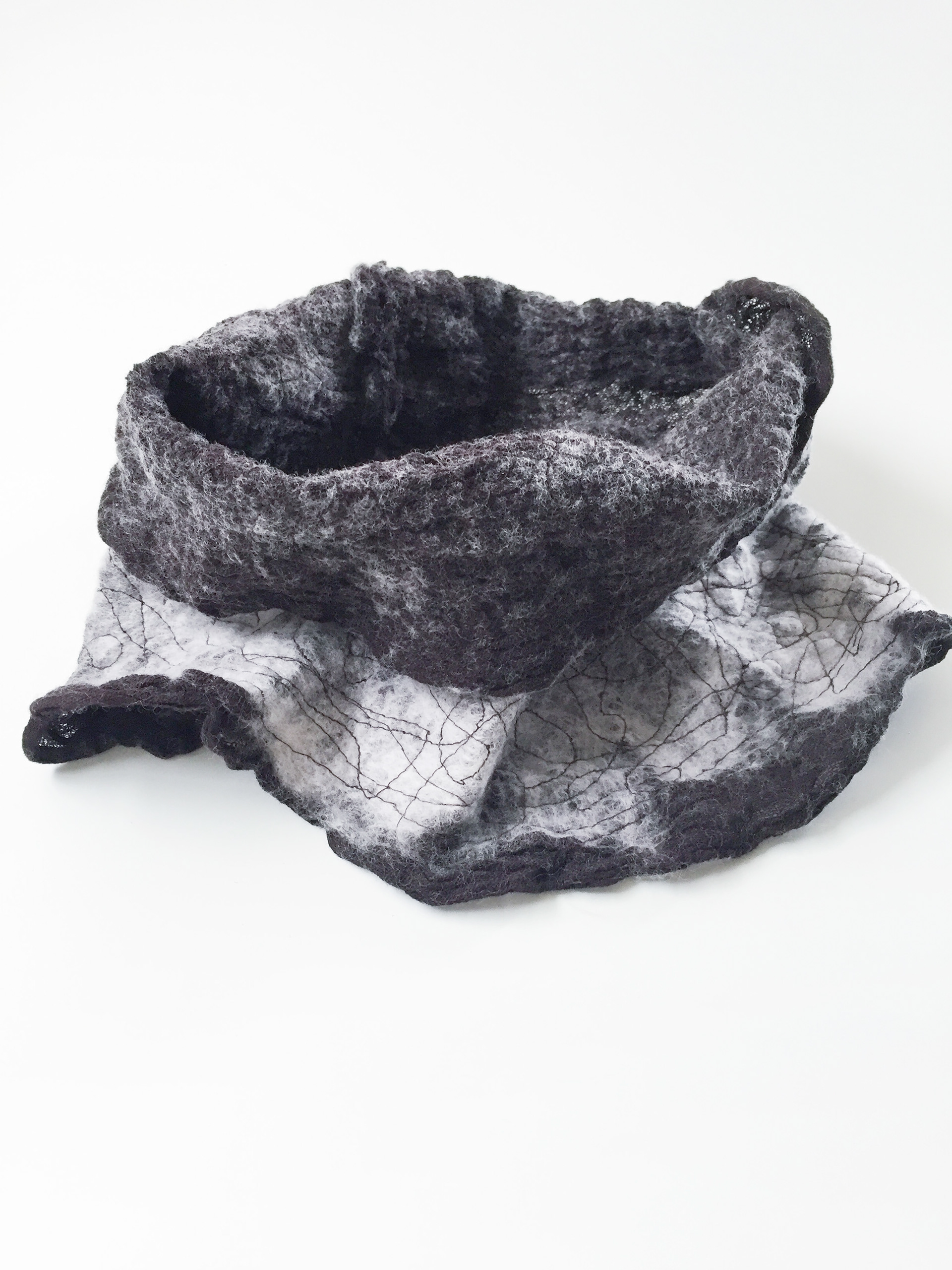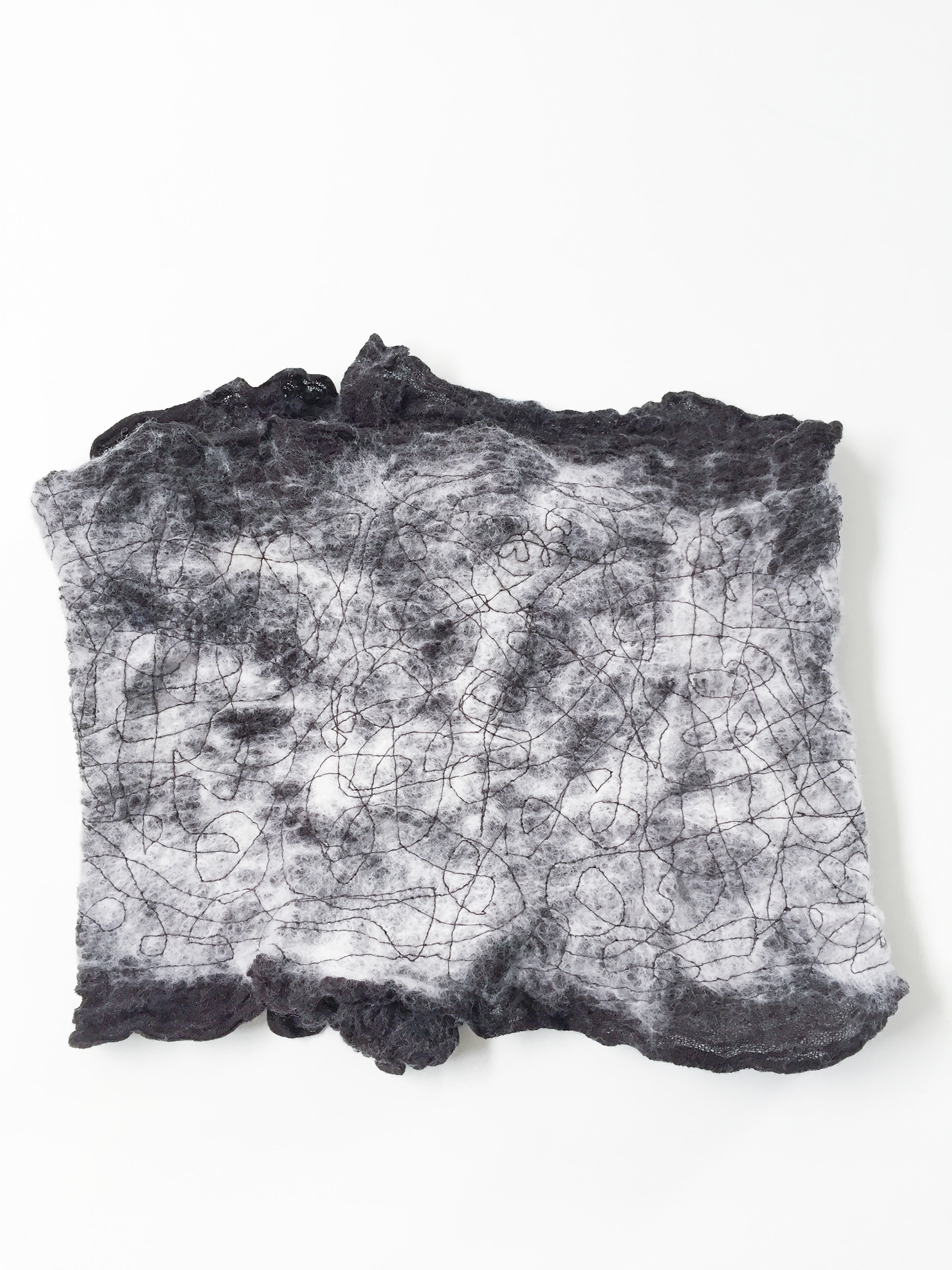 CYCLE COURSE [busy badger course] サイクルコースシリーズの、「あちこち忙しいタヌキコース」のスヌードです。 森や里山、東京の神社近くでも生活しているタヌキたちの移動コースを曲線のステッチで楽しくイメージしながら作ってみました。 メリノーウール100% 綿糸(ブラック)