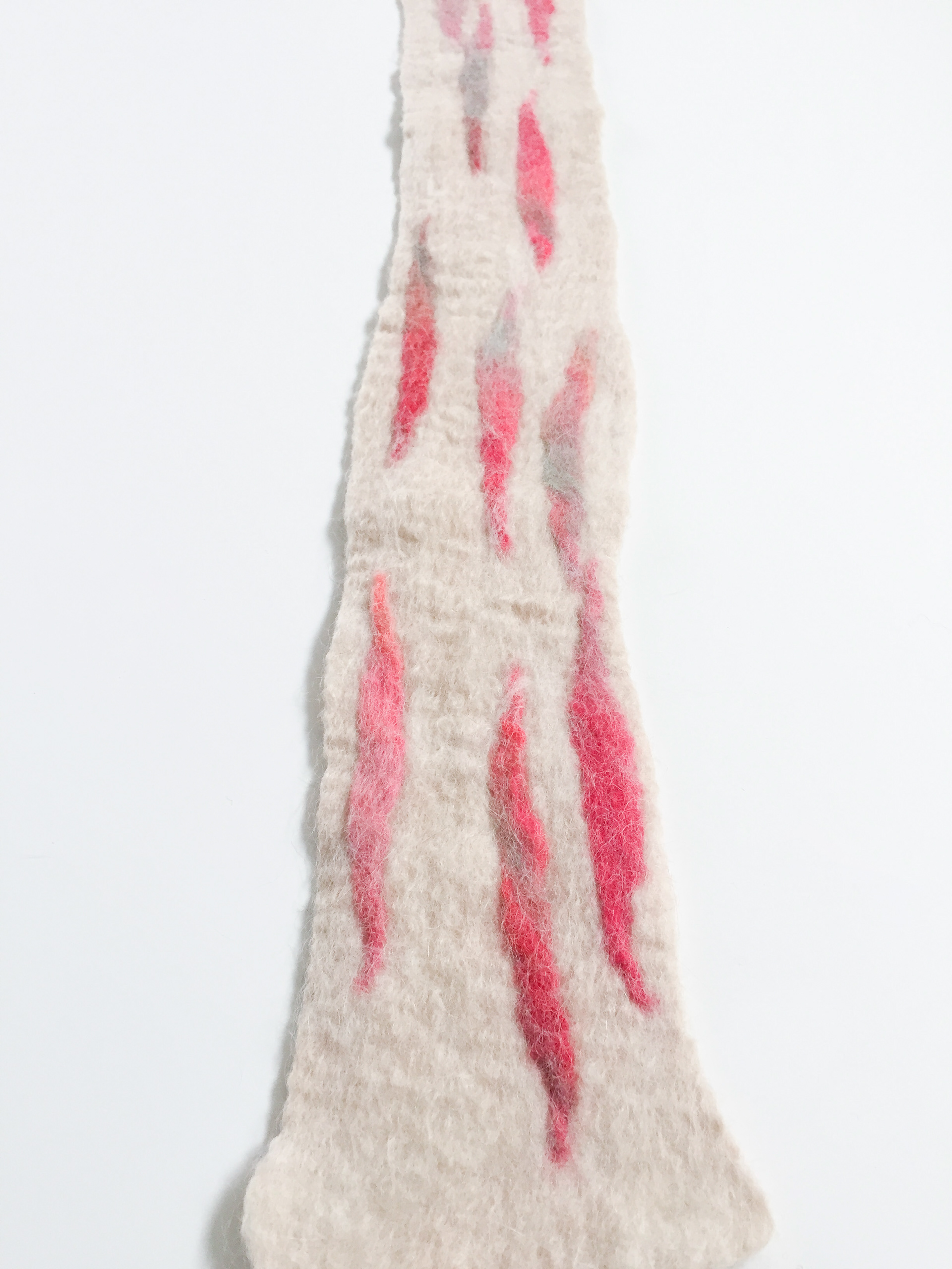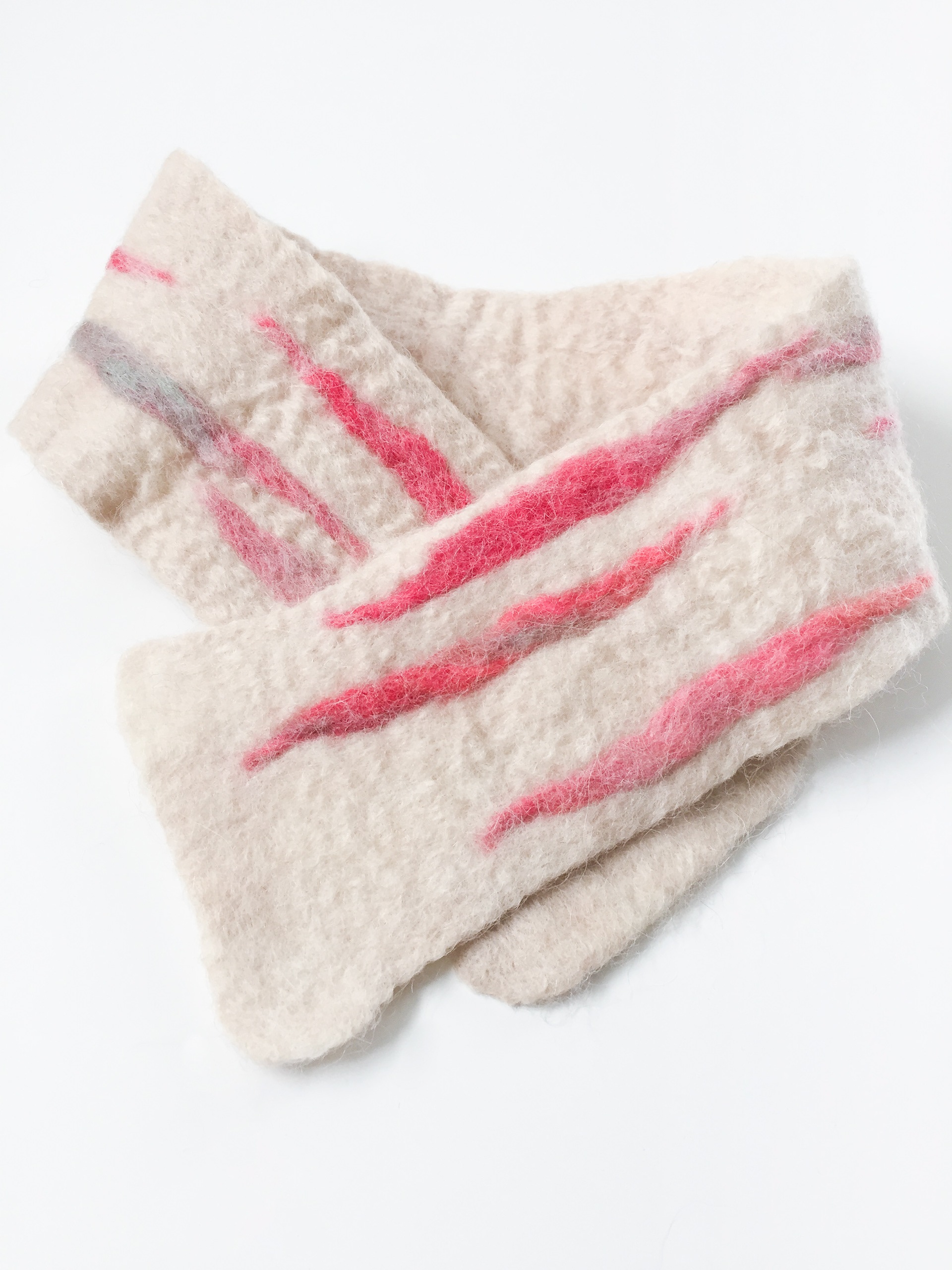 [spring pink] 春の色ずく花々と風をイメージしたスカーフです。 ピンク模様は、毛糸をコラージュしてフェルト化してます。 アルパカの細い毛はシルクのような肌触りです。 アルパカ100% ウール毛糸